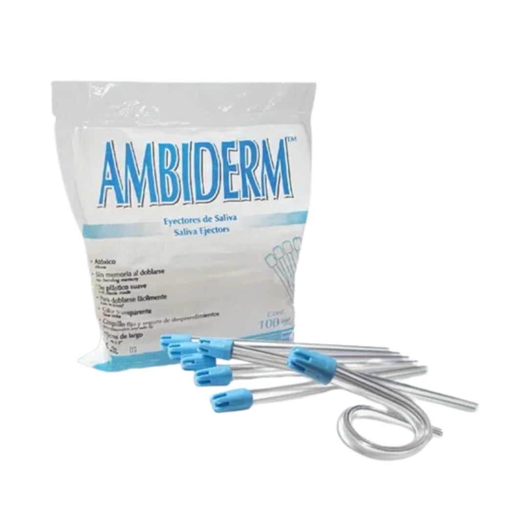 Los Eyectores de Saliva desechables Ambiderm están fabricados de PVC transparente no tóxico. De igual manera, para darle un mejor soporte, los eyectores Ambiderm tienen en su interior un hilo metálico que evita torceduras al mismo tiempo que lo mantiene recto.