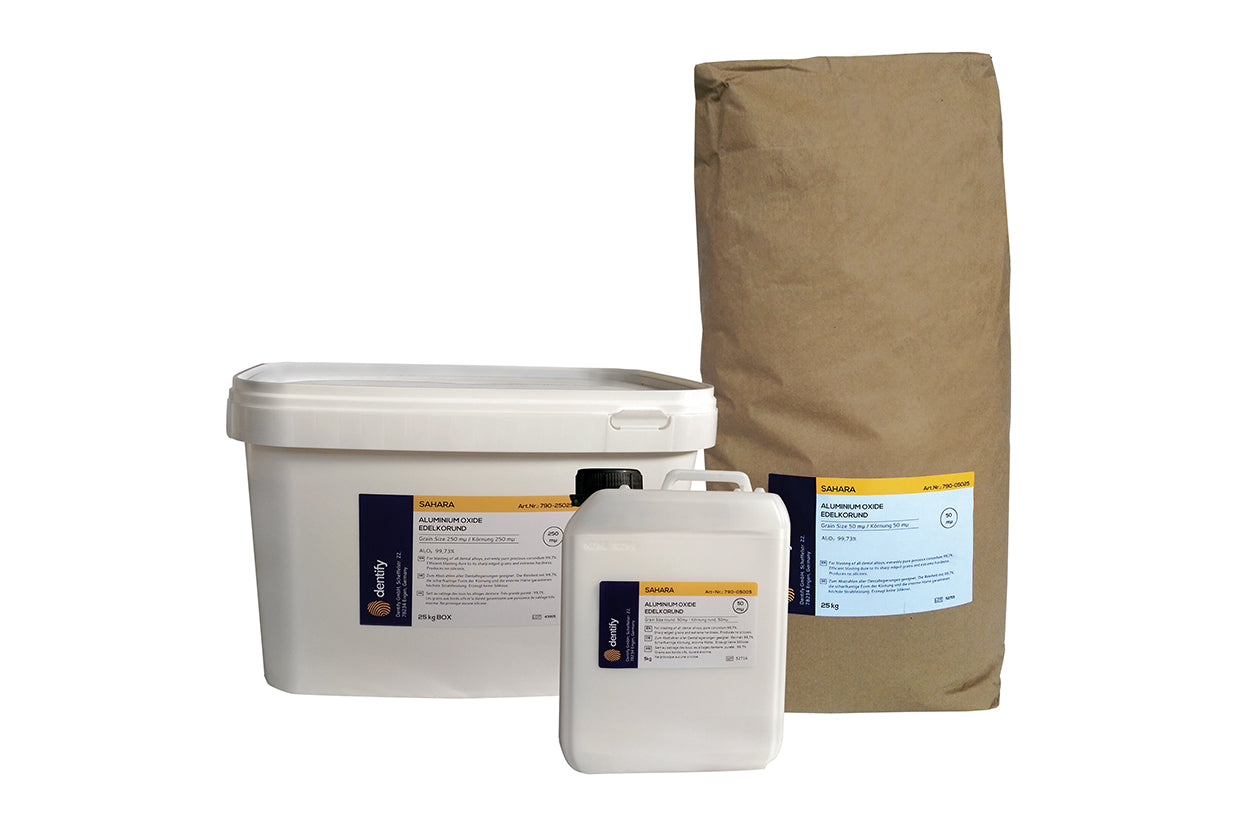 material de arenado dental de alta pureza para el laboratorio, usado para la preparación de superficies dentales, limpieza de restos de aleaciones, y para generar micro-retenciones que mejoren la adhesión de las cerámicas.